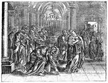 Description: Jesus writes on the ground with his finger during the trial of the adulterous woman.