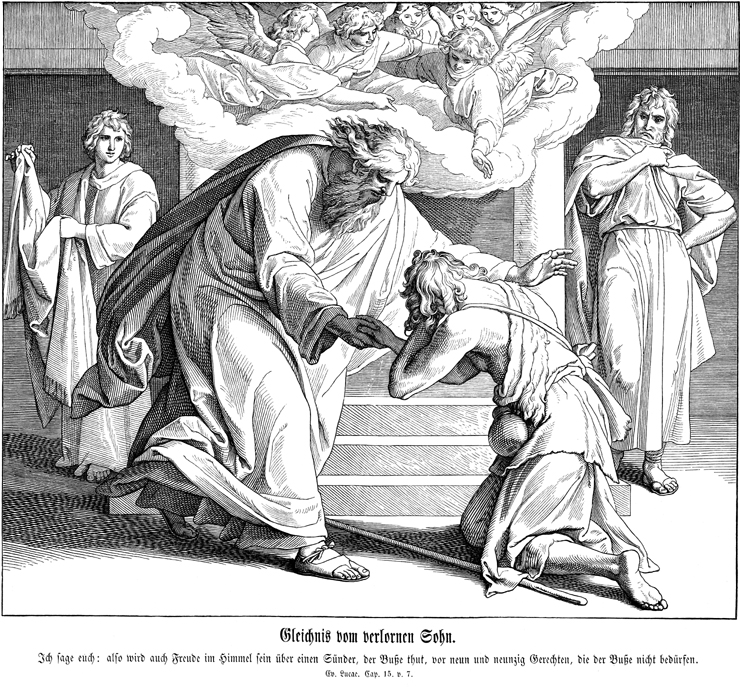 Description: Julius Schnorr von Carolsfeld's (1794-1872) depiction of the father embracing his son upon his return home, as angels rejoice in heaven.