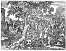 Description: Jesus speaks to Zacchaeus, who has climbed a sycamore tree in order to see Him.