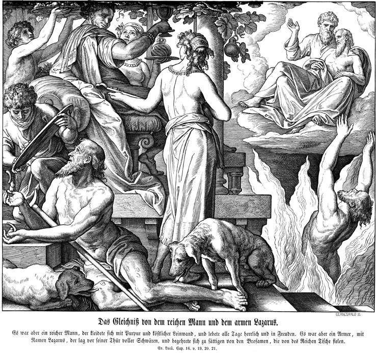 Description: Julius Schnorr von Carolsfeld's (1794-1872) depiction of Lazarus sitting at the gate of the rich man, who lives in luxury. On the right, the rich man begs Abraham to allow Lazarus to put water on his tongue to quench his torment.