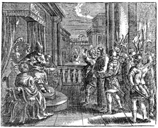 Description: Jesus is tried before the high priest Caiaphas. A group gathers around the fire in the courtyard.