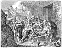 Description: Jesus is buried in the tomb of Joseph of Arimathea at the aid of Nicodemus and a group of women.