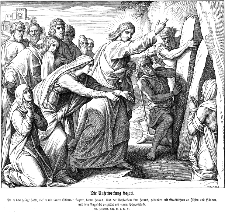 Description: Julius Schnorr von Carolsfeld's (1794-1872) depiction of Jesus raising Lazarus from the dead.