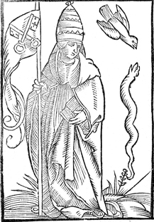 Description: The Pope listens to the snake, representing the devil, and the bird, representing the Holy Spirit argue.