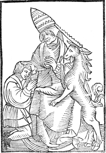 Description: As the Pope gives a blessing, a unicorn knocks his crown off his head.