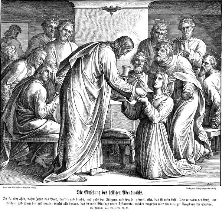 Description: Julius Schnorr von Carolsfeld's (1794-1872) depiction of Jesus giving communion to his disciples; Judas Iscariot is depicted in the back left without halo.