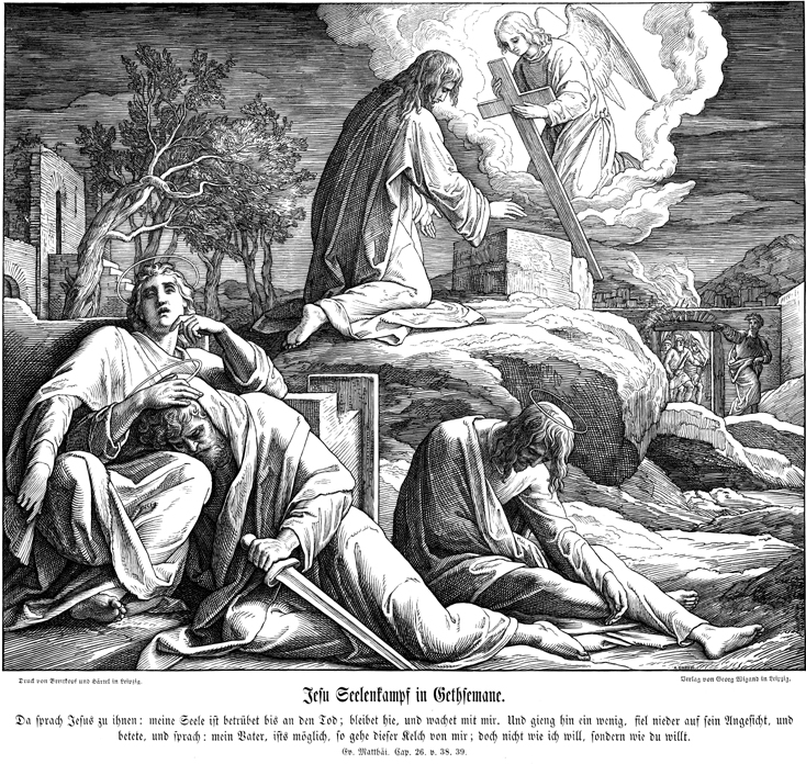 Description: Julius Schnorr von Carolsfeld's (1794-1872) depiction of Jesus praying in the Garden of Gethsemane as the Inner Circle sleeps; in the background Judas Iscariot leads a band of Roman soldiers to arrest Jesus.