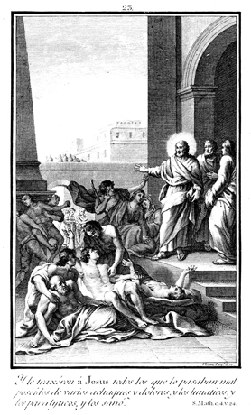 Description: Jesus teaching in the synagogue at Galilee. Those who were ill and possessed by evil spirits were brought to him.