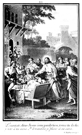 Description: Jesus heals a paralyzed man, who then takes up his mat and walks.