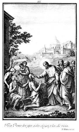 Description: Jesus heals two blind men. The Jerusalem temple is visible in the background.