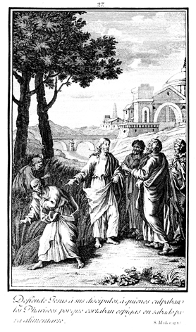 Description: The Pharisees question Jesus about allowing his disciples to pick grain on the Sabbath, as the Jerusalem temple is visible in the background.