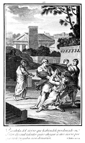 Description: The master forgives the debt of the unmerciful servant, but the unmerciful servant fails to extend the same forgiveness to his debtor, whom he takes by the throat in this image.