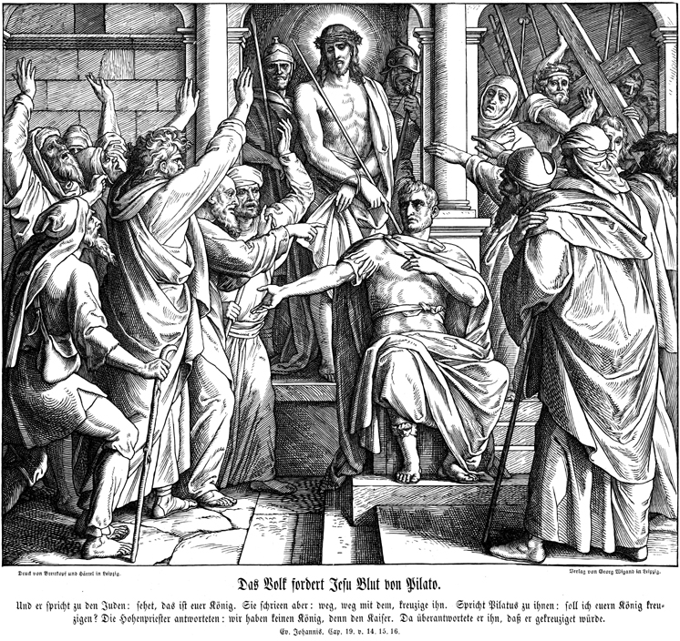 Description: Julius Schnorr von Carolsfeld's (1794-1872) depiction of the mob calls for Jesus' crucifixion as Pilate sits on the mercy seat.