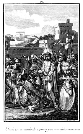 Description: The soldiers place a crown of thorns and a purple robe on Jesus and mock him.
