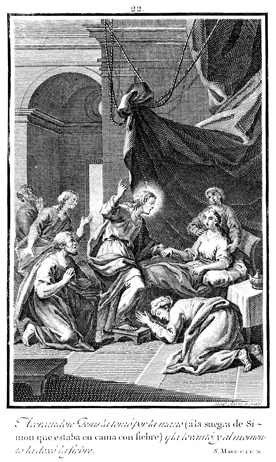 Description: Jesus heals Peter’s mother-in-law of a fever by touching her hand.
