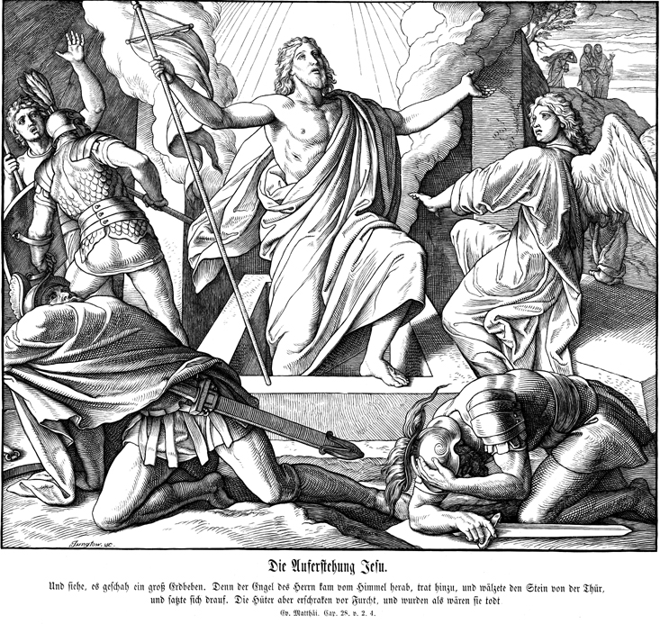 Description: Julius Schnorr von Carolsfeld's (1794-1872) depiction of Jesus raising from the dead as the women approach the tomb in the background.