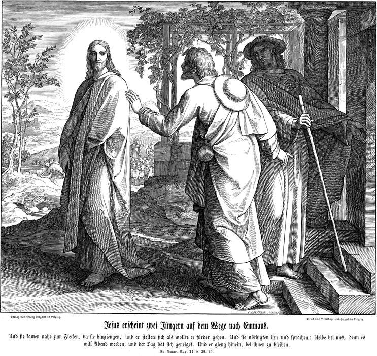 Description: Julius Schnorr von Carolsfeld's (1794-1872) depiction of Jesus conversing with Cleopas and another disciple on the road to Emmaus. Upon coming to Emmaus, the disciples insist that he stay with them for the night.