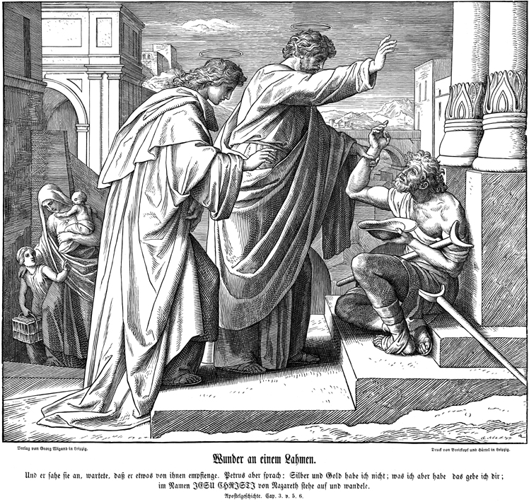 Description: Julius Schnorr von Carolsfeld's (1794-1872) depiction of Peter healing the lame man outside the temple.