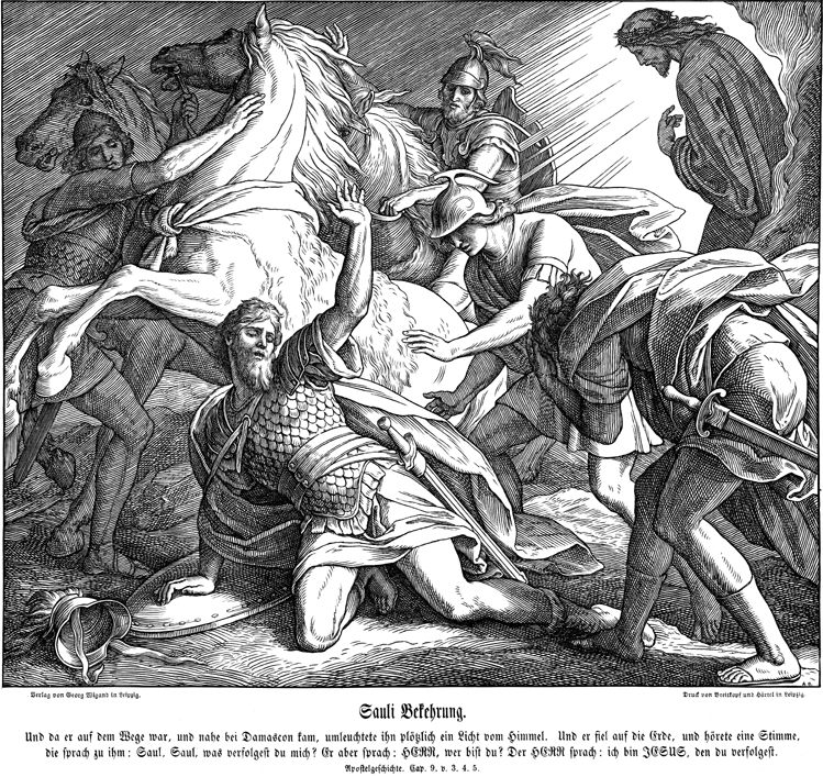Description: Julius Schnorr von Carolsfeld's (1794-1872) depiction of Jesus appearing to Saul on the road to Damascus.