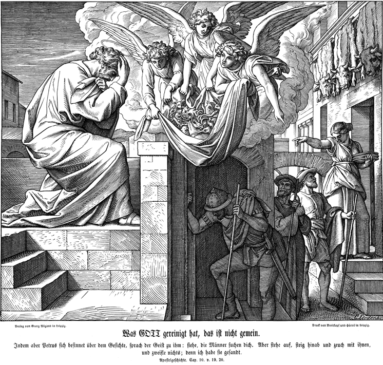 Description: Julius Schnorr von Carolsfeld's (1794-1872) depiction of Peter's vision of the sheet filled with clean and unclean animals as Cornelius' servants arrive.