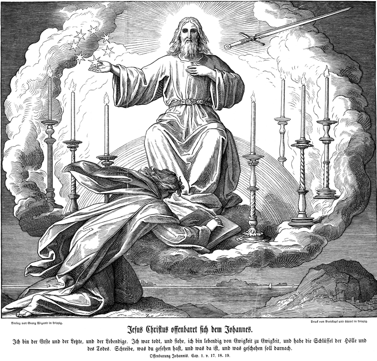 Description: Julius Schnorr von Carolsfeld's (1794-1872) depiction of John writing the book of Revelation from the island of Patmos as he sees the vision of the one like a Son of Man among the lampstands.