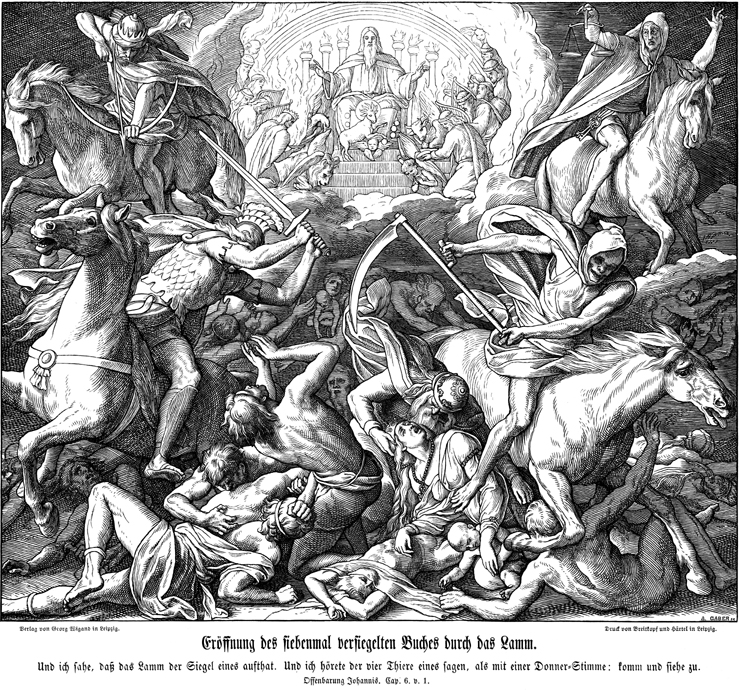 Description: Julius Schnorr von Carolsfeld's (1794-1872) depiction John’s vision of the Lamb approaching the throne as the one worthy to open the scroll; the twenty-four elders with their incense and harps cast down their crowns and worship the Lamb, as the four living creatures and the entire heavenly host join them (top) and the four horsemen of the apocalypse (seals 1-4).