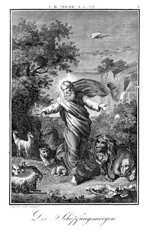 Description: God creates the earth, birds, and animals. The engraver, Carl Schuler, has placed his signature at the bottom left. As the numeral at the top right indicates, this is plate #1 in a series of illustrations.