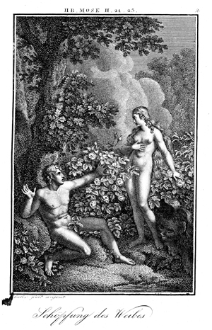 Description: Adam and Eve are in the Garden of Eden naked. The engraver, Carl Schuler, has placed his signature at the bottom left. As the numeral at the top right indicates, this is plate #2 in a series of illustrations.