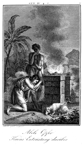 Description: Cain and Abel offer sacrifices to God; Abel's is accepted and Cain's is rejected. The engraver, Carl Schuler, has placed his signature at the bottom left. As the numeral at the top right indicates, this is plate #6 in a series of illustrations.