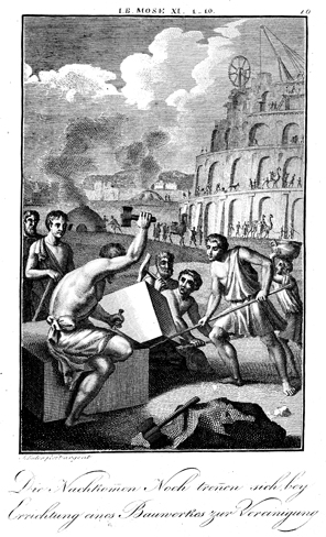 Description: The Tower of Babel is constructed. The engraver, Carl Schuler, has placed his signature at the bottom left. As the numeral at the top right indicates, this is plate #10 in a series of illustrations.