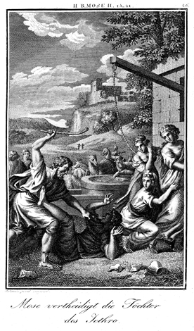 Description: Moses kills an Egyptian who was beating a Hebrew. The engraver, Carl Schuler, has placed his signature at the bottom left. As the numeral at the top right indicates, this is plate #26 in a series of illustrations.