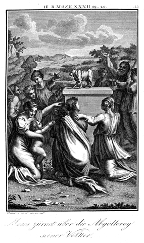 Description: As God gives the Ten Commandments to Moses on Mt. Sinai, Israel worships the golden calf and so violates the law. The engraver, Carl Schuler, has placed his signature at the bottom left. As the numeral at the top right indicates, this is plate #33 in a series of illustrations.