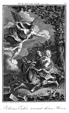 Description: Balaam beats his donkey for stopping, as an angel stands in its way with sword raised. The engraver, Carl Schuler, has placed his signature at the bottom left. As the numeral at the top right indicates, this is plate #37 in a series of illustrations.