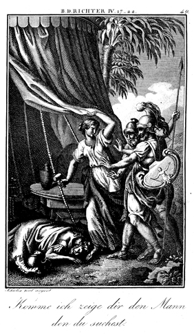 Description: Jael shows Barak that she has killed Sisera. The engraver, Carl Schuler, has placed his signature at the bottom left. As the numeral at the top right indicates, this is plate #40 in a series of illustrations.