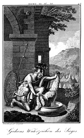 Description: Gideon wrings out the dew from his fleece and receives confirmation from God that he should lead the Israelites into battle. The engraver, Carl Schuler, has placed his signature at the bottom left. As the numeral at the top right indicates, this is plate #42 in a series of illustrations.
