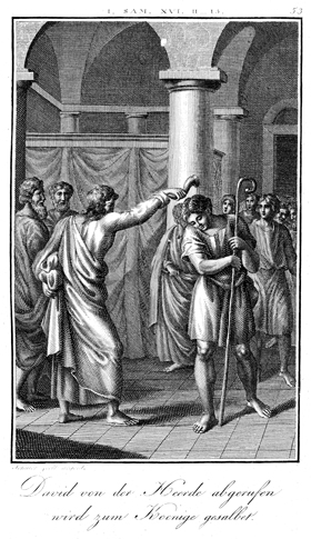 Description: Samuel anoints David king of Israel in the presence of his father and brothers The engraver, Carl Schuler, has placed his signature at the bottom left. As the numeral at the top right indicates, this is plate #53 in a series of illustrations.