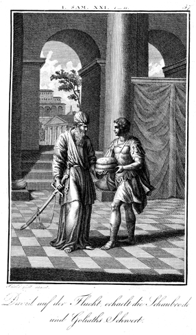 Description: David receives the consecrated bread and the sword of Goliath from the priest Ahimelech at the temple in Nob. The engraver, Carl Schuler, has placed his signature at the bottom left. As the numeral at the top right indicates, this is plate #57 in a series of illustrations.