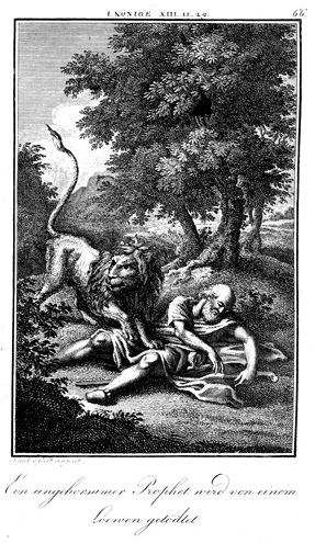 Description: The man of God is killed by a lion for failing to obey God's command The engraver, Carl Schuler, has placed his signature at the bottom left. As the numeral at the top right indicates, this is plate #66 in a series of illustrations.