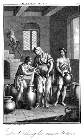 Description: At Elisha’s instructions, the widow fills every jar in the city from a single jug, and so pays all her creditors. The engraver, Carl Schuler, has placed his signature at the bottom left. As the numeral at the top right indicates, this is plate #73 in a series of illustrations.