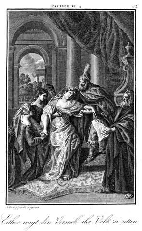 Description: Esther faints in the presence of the king. The engraver, Carl Schuler, has placed his signature at the bottom left. As the numeral at the top right indicates, this is plate #83 in a series of illustrations.