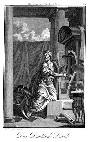 Description: David, with harp in hand, receives inspiration from God. The engraver, Carl Schuler, has placed his signature at the bottom left. As the numeral at the top right indicates, this is plate #85 in a series of illustrations.