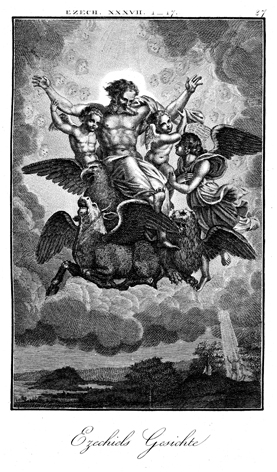 Description: Ezekiel receives a vision(bottom right) of God reigning above and the four creatures (man, lion, ox, and eagle) The engraver, Carl Schuler, has placed his signature at the bottom left. As the numeral at the top right indicates, this is plate #87 in a series of illustrations.