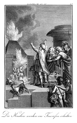 Description: Nebuchadnezzar has the three youths (renamed Shadrach, Meshach, and Abednego) thrown into the fiery furnace for not bowing to the idol, but an angel appears to protect them. The engraver, Carl Schuler, has placed his signature at the bottom left. As the numeral at the top right indicates, this is plate #89 in a series of illustrations.