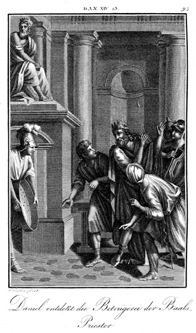 Description: King Astyages and Daniel enter the temple of Bel to notice the bread is gone but that there are footprints in the ashes. The engraver, Carl Schuler, has placed his signature at the bottom left. As the numeral at the top right indicates, this is plate #94 in a series of illustrations.