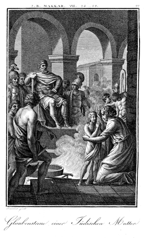 Description: King Antiochus prepares a pot of boiling water for the martyrdom of a mother and child who refuse to eat pig's flesh. The engraver, Carl Schuler, has placed his signature at the bottom left. As the numeral at the top right indicates, this is plate #99 in a series of illustrations.