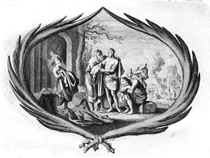 Description: A man clothes a beggar, following Jesus’ saying, “I was naked and you clothed me”.