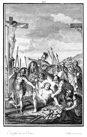 Description: Soldiers nail Jesus' hand to the cross, as the crowd watches.