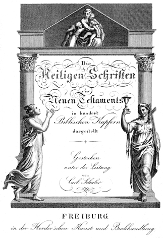 Description: This architectural title-page border contains columns on the sides, two young women, one with praying hands, the other holding a cross and a chalice and host. On the top of the border sits a young mother with her children. The engravings this volume were done under the direction of Carl Schuler (1785–1852).