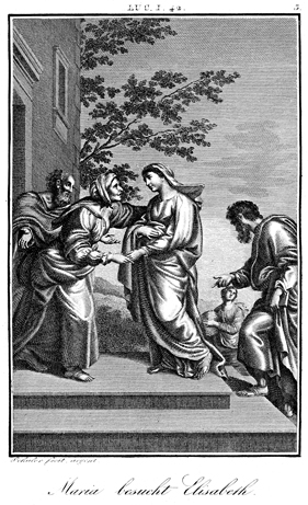 Description: Mary visits her cousin Elizabeth after finding out they are both pregnant. The engraver, Carl Schuler (1785-1852), has placed his signature at the bottom left. As the numeral at the top right indicates, this is plate #3 in a series of illustrations.