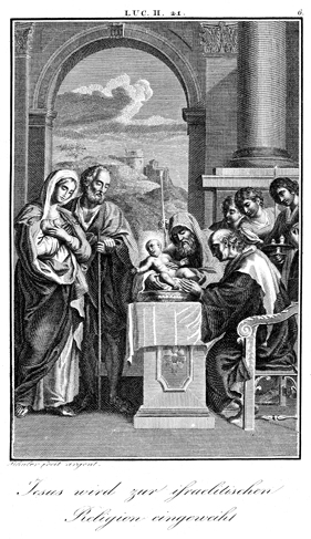 Description: Mary and Joseph take Jesus to the temple in Jerusalem to be circumcised. The engraver, Carl Schuler (1785-1852), has placed his signature at the bottom left. As the numeral at the top right indicates, this is plate #6 in a series of illustrations.